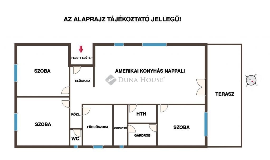 A ház elrendezése praktikus és modern: három szoba, amerikai konyhás nappali, fürdő WC-vel, zuhanyzó+WC, egy vendég WC, gardrób, háztartási helyiség és előszoba található .