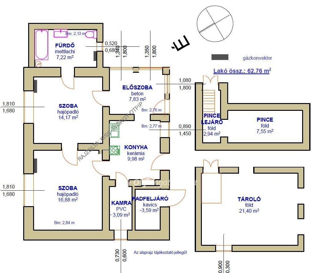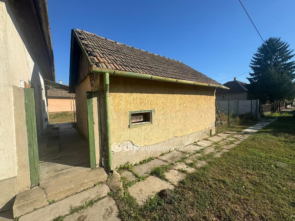 Helyiségek: 2 szoba, fürdő (WC-vel egyben), előszoba, konyha, kamra, padfeljáró, melléképület pincével.