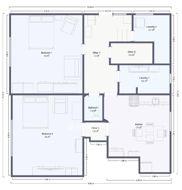 A lakás elrendezése átgondolt, tágas és jól élhető tereket biztosít. A két, egyenként 22 m2-es, laminált parkettával burkolt szoba világos, nyugodt életteret kínál, ideális pihenéshez, családi együttlétekhez vagy akár otthoni munkavégzéshez. A 17 m2-es konyha praktikus kialakításának köszönhetően kényelmesen használható, elegendő helyet biztosít a mindennapi főzéshez és étkezéshez. A lakás közlekedői (11 m2 és 15 m2) tágasak és jól szervezettek, biztosítva a helyiségek kényelmes megközelítését. Az 5,1 m2-es félszoba kiválóan alkalmas dolgozószobának, gardróbnak vagy vendégszobának. A fürdőszoba és WC egy helyiségben kapott helyet (5,5 m2), emellett külön mellékhelyiség is rendelkezésre áll (1,8 m2), ami a mindennapi komfortot jelentősen növeli. A 2 m2-es erkély kellemes lehetőséget kínál egy nyugodt reggeli kávéhoz, míg a további közlekedő terek funkcionálisan teszik teljessé a lakás használhatóságát.