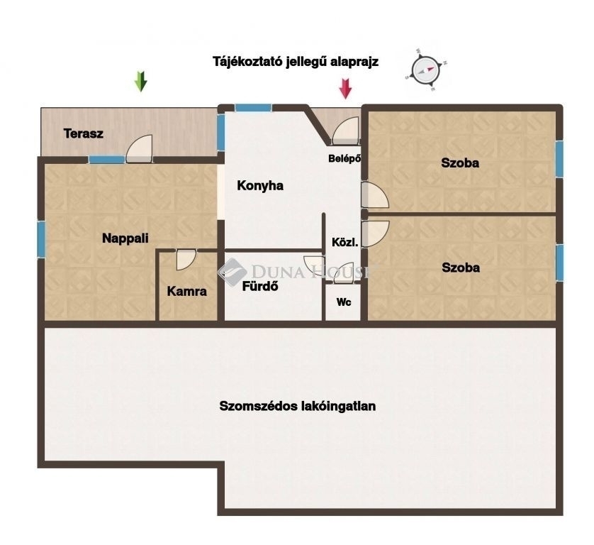 Az otthonban két hálószoba, nappali, gépesített konyha, fürdő, wc valamint közlekedő és kamra helyiségek kerültek kialakításra.