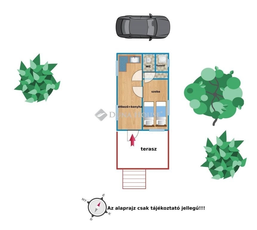 A ház belső elrendezését tekintve áll: konyha + étkező, szoba, fürdő, wc, nagy fedett terasz, kerti tároló.