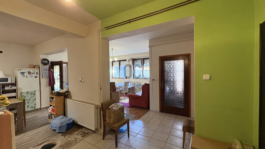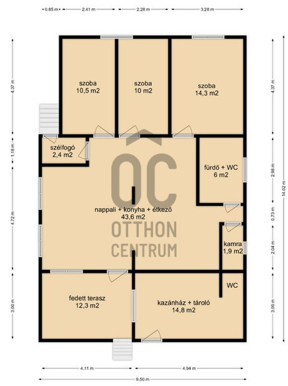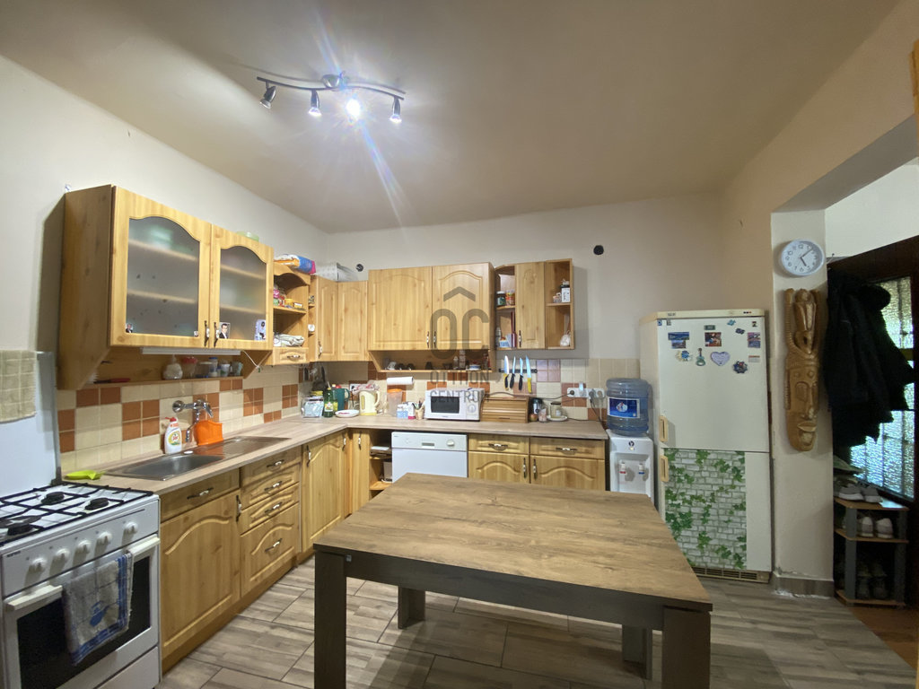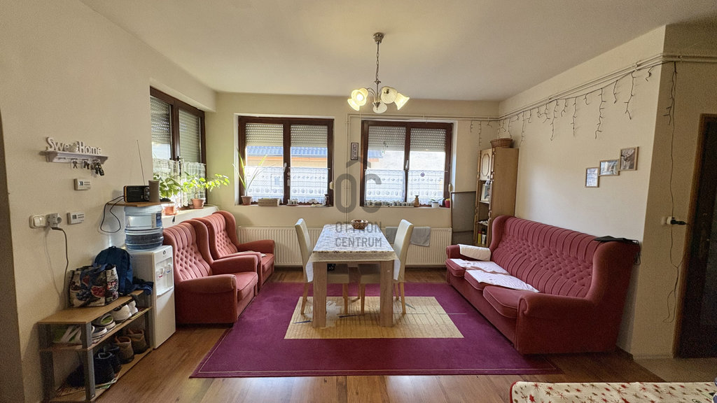 A tégla építésű ingatlan nettó 104 m² (bruttó 130 m²), elosztása: 3 szoba, tágas konyha–étkező–nappali, fürdő, kamra, terasz.