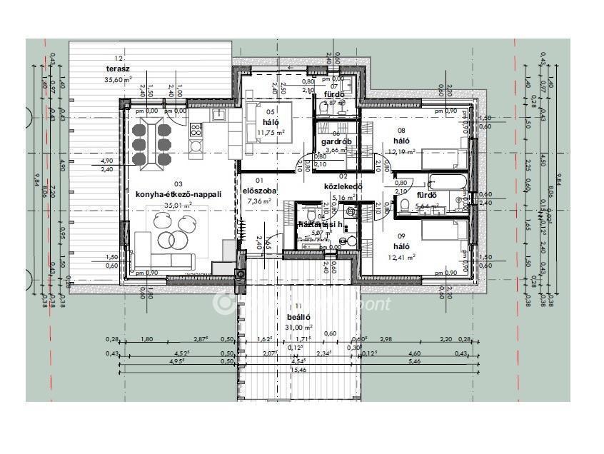 fedett, nagy terasz, közvetlen kertkapcsolattal