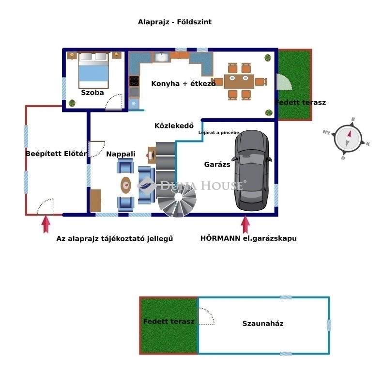 Előtér, két nappali, három hálószoba, modern konyha elegáns étkezővel, fürdőszoba WC-vel, külön WC, garázs, pince
