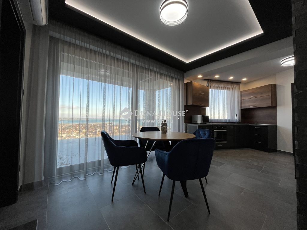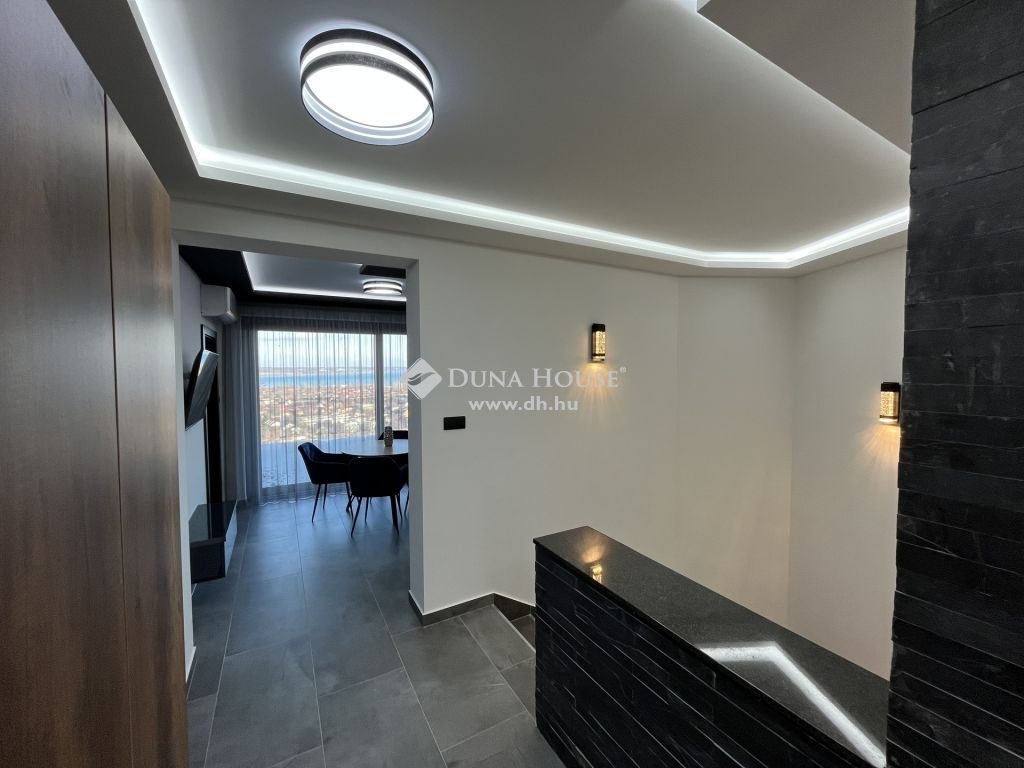 A felső szinten garázs, amerikai konyhás nappali, hálószoba, hálószoba fürdőszoba kapcsolattal, vendég mosdó, valamint egy 25 négyzetméteres panoráma terasz található.