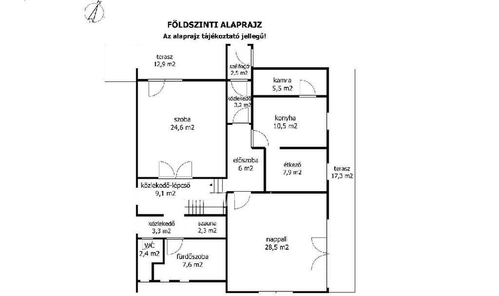 Az 1985-ben, minőségi anyagok felhasználásával épült, azóta folyamatosan karbantartott, felújított házban egy alagsor (62 m2) és egy 2 szintes lakórész került kialakításra. A lakórész földszint (129 m2) + tetőteres (84 m2), szinten belül félszint eltolásos megoldással. A lakórészben 6 szoba, konyha, étkező, 2 fürdőszoba, közlekedők, lépcsők, valamint 2 nagy terasz (17,3 és 12,9 m2) és 2 erkély (5,4 és 3,3 m2) található.