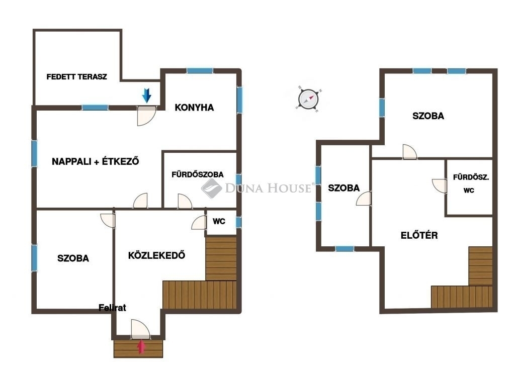 Földszint: amerikai konyhás nappali kandalló előkészítéssel, konyha kerámialapos villanytűzhellyel és wok gázfőzőlappal, szoba, előszoba, kamra, fürdőszoba, külön WC, fedett terasz