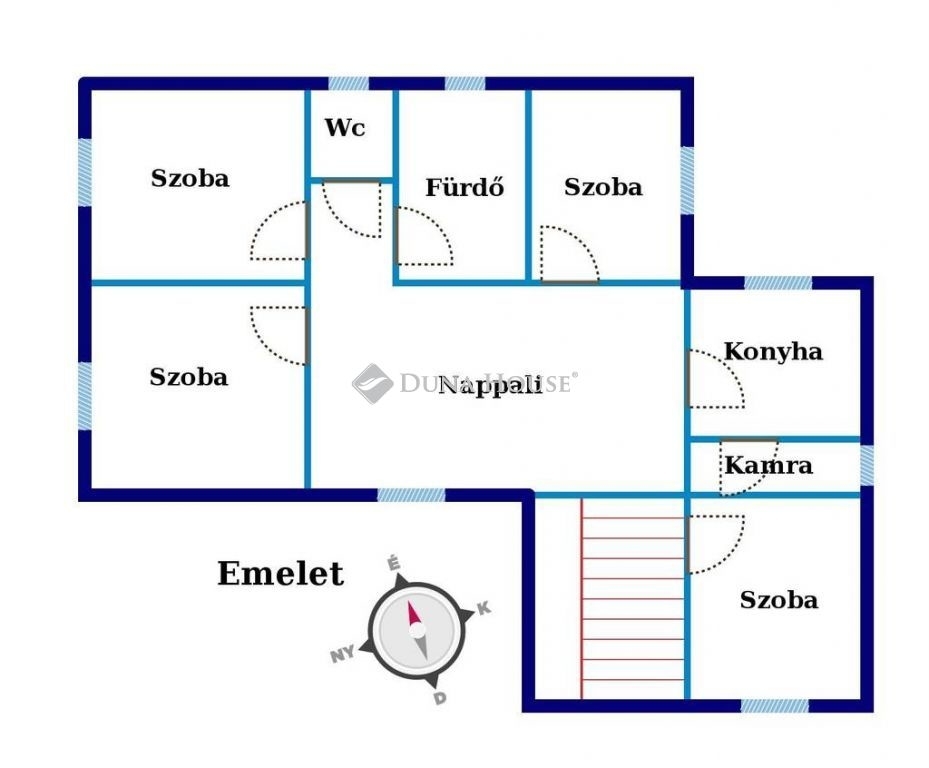 Az emeleten található napfényes és tágas nappali négy hálószobával, egy fürdőszoba tusolóval és külön wc-vel további életteret biztosítanak, míg a külön konyha és kamra lehetővé teszi a teljesen külön életvitel kialakítását. Fűtése lapradiátorokkal megoldott.