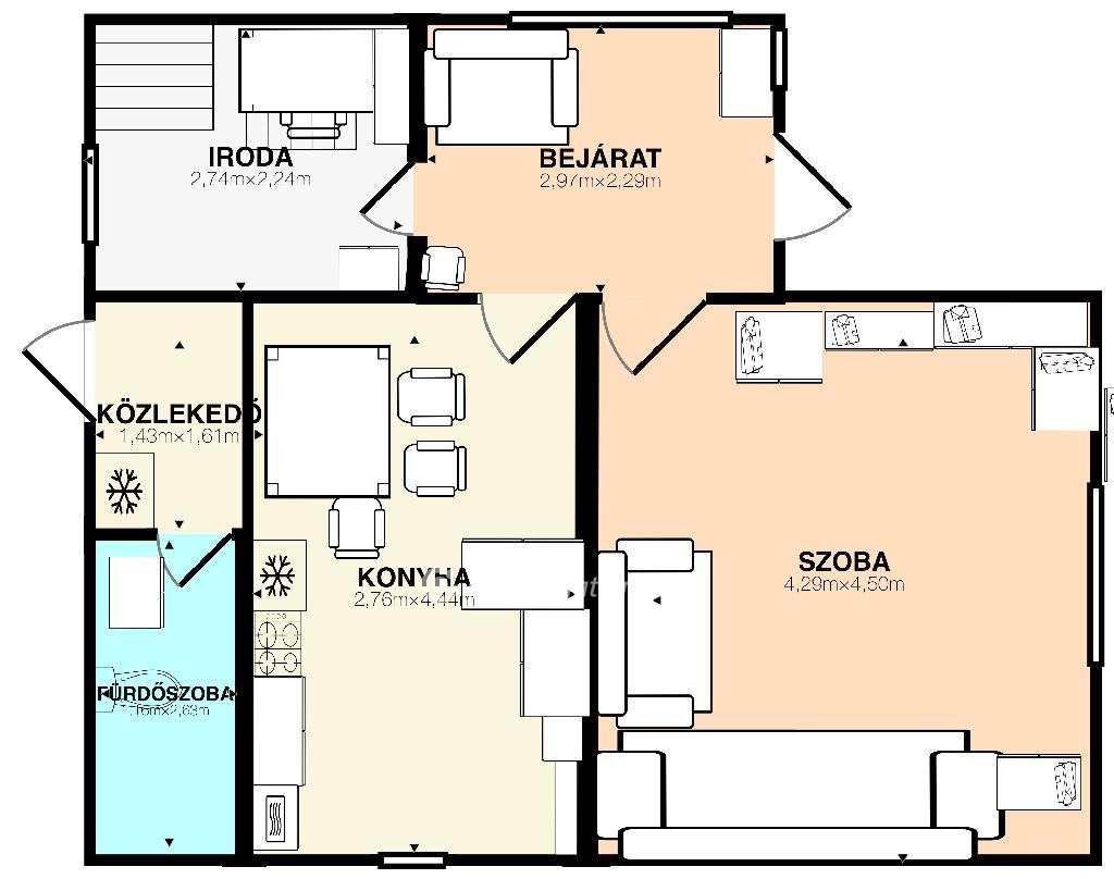 A földszinten előszoba, nappali, konyha és fürdőszoba található, az emeleten három hálószoba, egy további fürdőszoba és egy igény szerint konyhává alakítható szoba kapott helyet. A ház világos, jól szellőző, elrendezése praktikus és kényelmes.