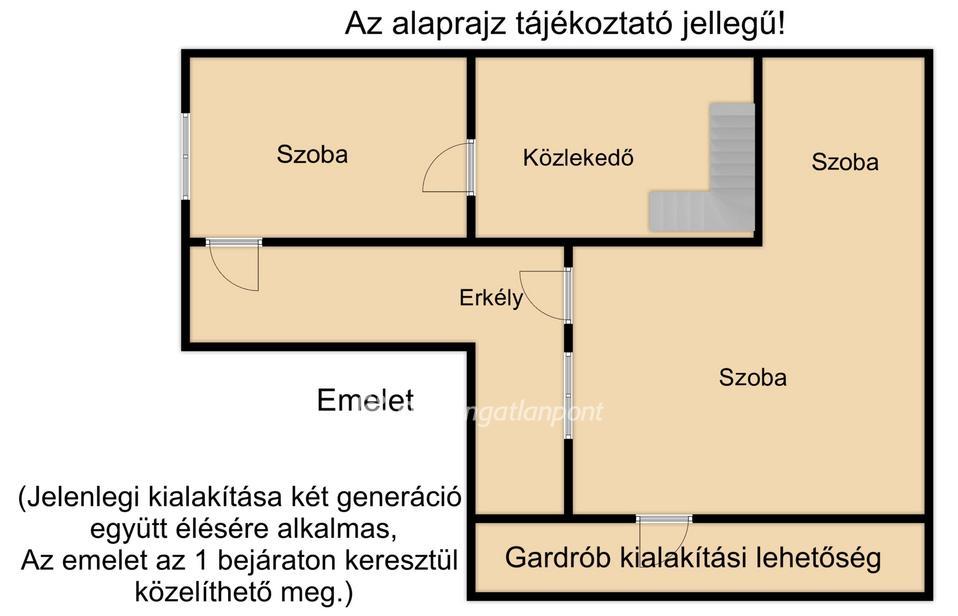 Emelet: 2 külön nyíló szoba, közlekedő, gardrób, erkély