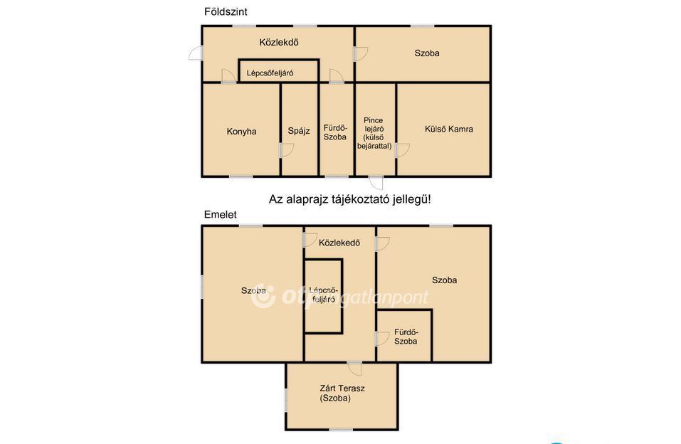 Földszint: közlekedő, konyha, zuhany+WC, félszoba, továbbá külső bejárattal kamra