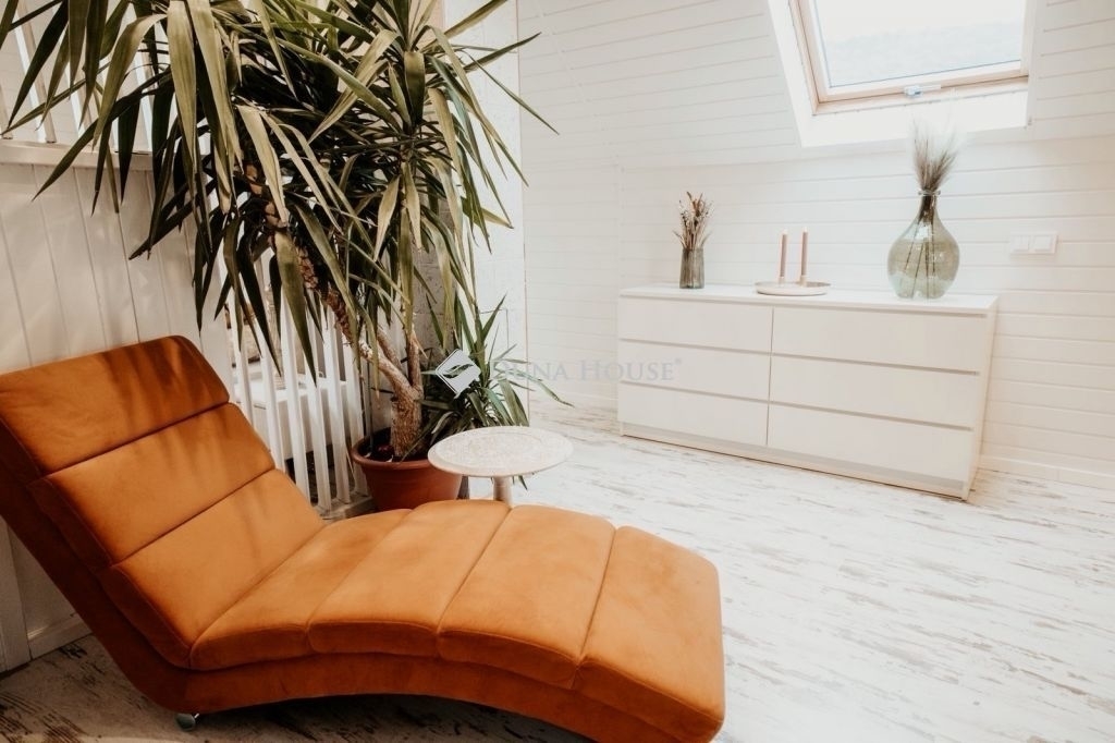 A lakótér álmennyezettel van ellátva, amely modern és esztétikus megjelenést kölcsönöz.
