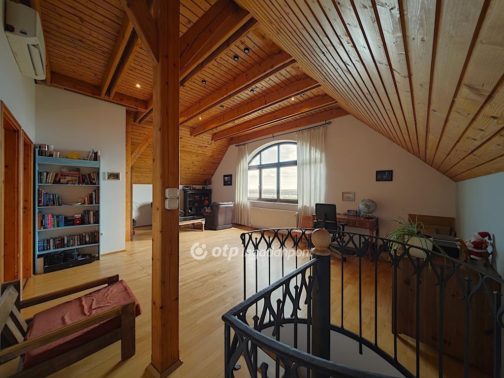 Az emeletre egy jól használható, kényelmes méretű, stílusos csigalépcsőn jutunk, ahol a nagy üvegfelületen kitekintve egyedülálló kilátás tárul elénk az Omszk-tó ? Lupa Beach ? Megyeri híd panorámájával. Itt igazi élmény lehet a reggeli kávé, délutáni tea vagy esti pohár bor elfogyasztása. De tökéletes hangulatot teremthet egy olvasósarok kialakításához vagy egy nyugtató távolba merengés helyszínéül.