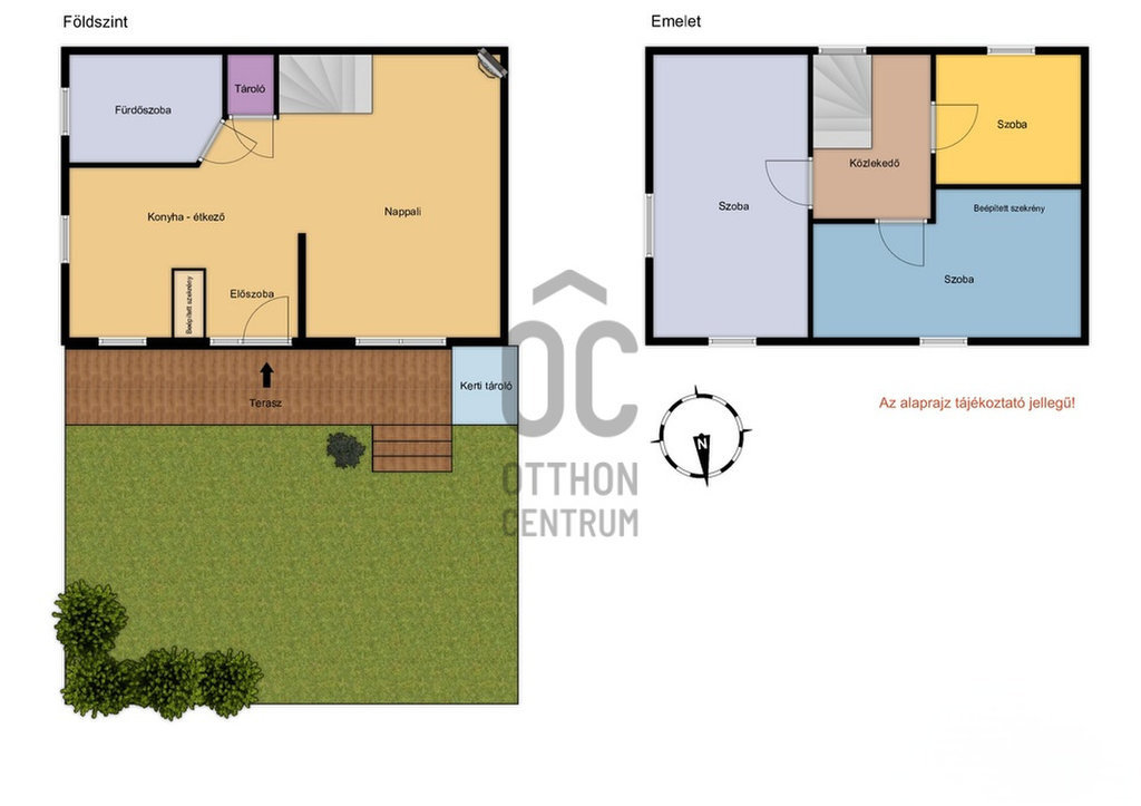 Épület: 2 szintes, sorház jellegű (nincs közös fala a szomszéd ingatlannal)