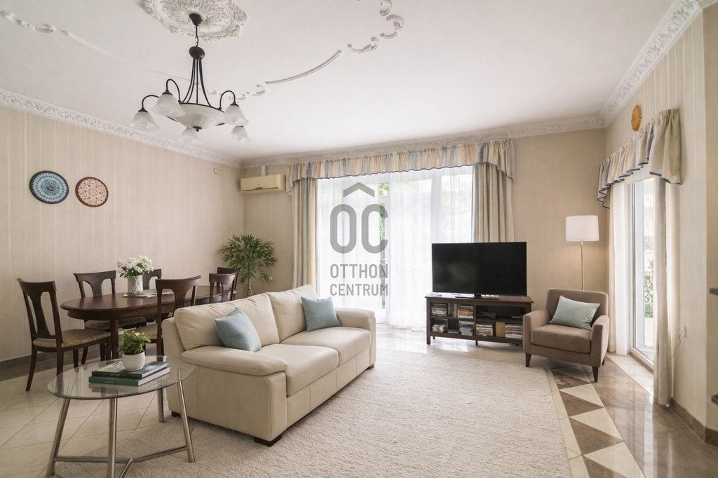 A gondozott, füvesített kert, fákkal és zöld növényzettel, valódi nyugalmi szigetet teremt. Az automata öntözőrendszer gondoskodik arról, hogy a kert mindig üde és rendezett maradjon.