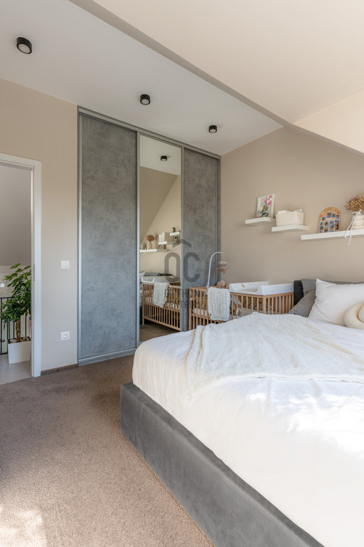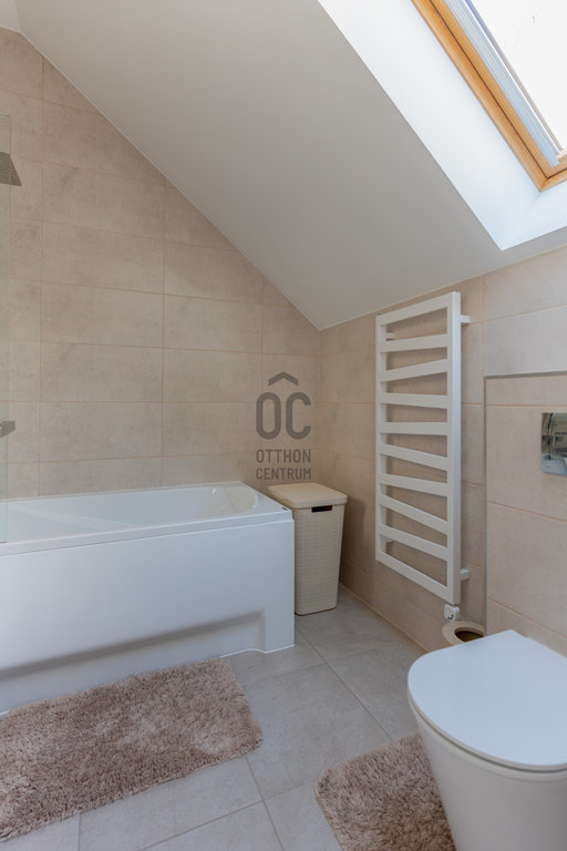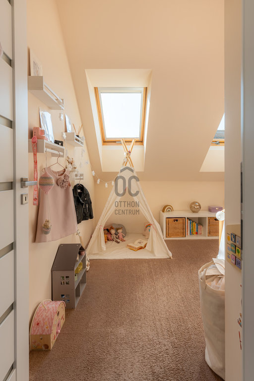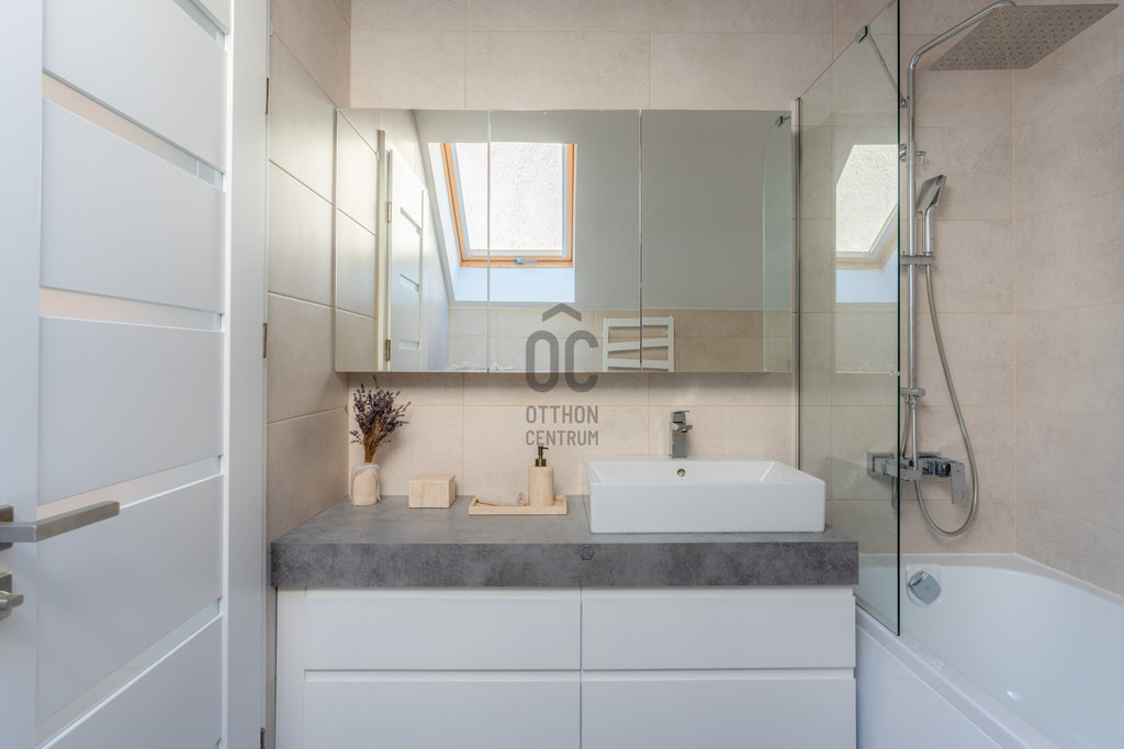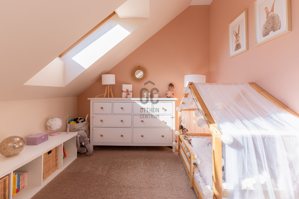 Felső szint: hálószoba gardróbbal, második szoba (gyerekszoba / dolgozó), kádas fürdő