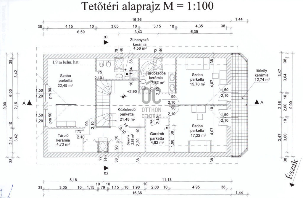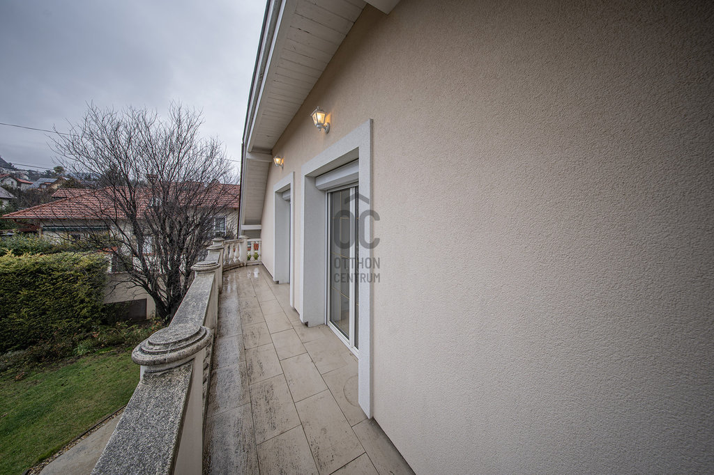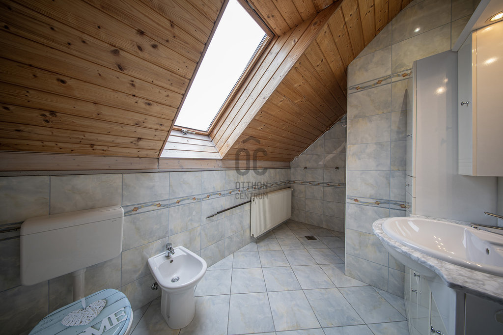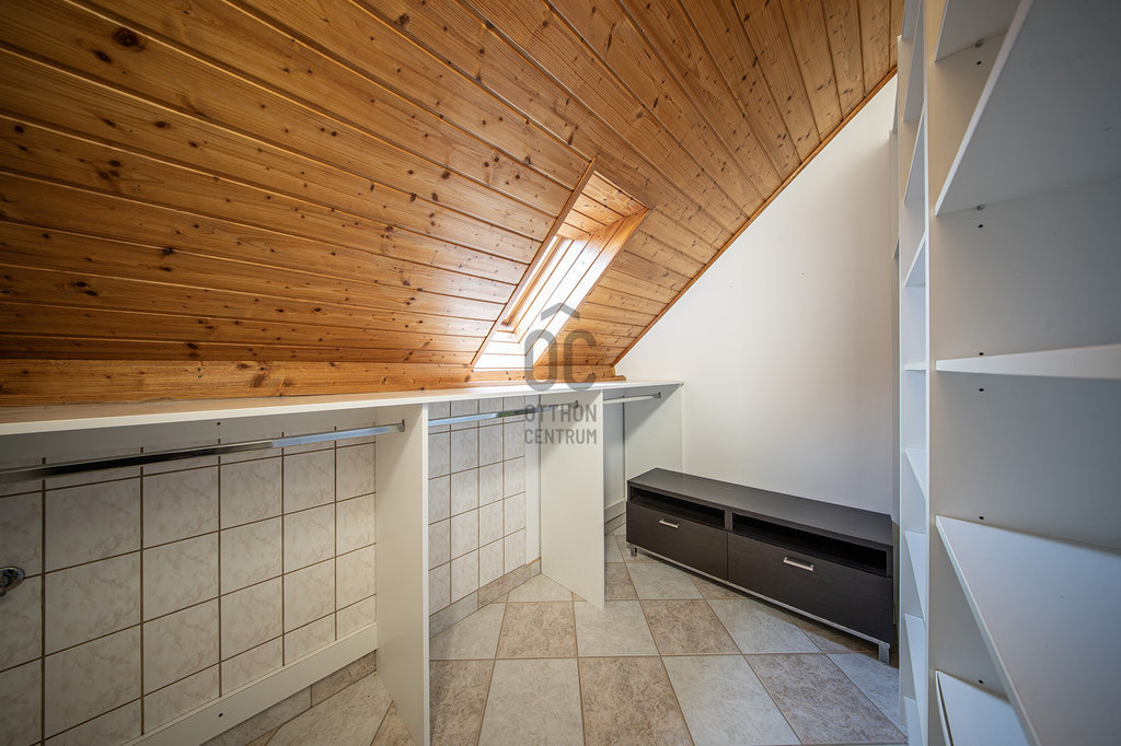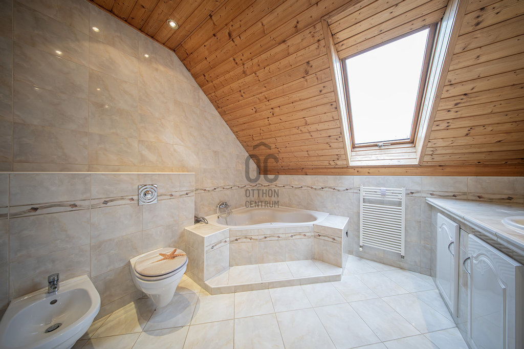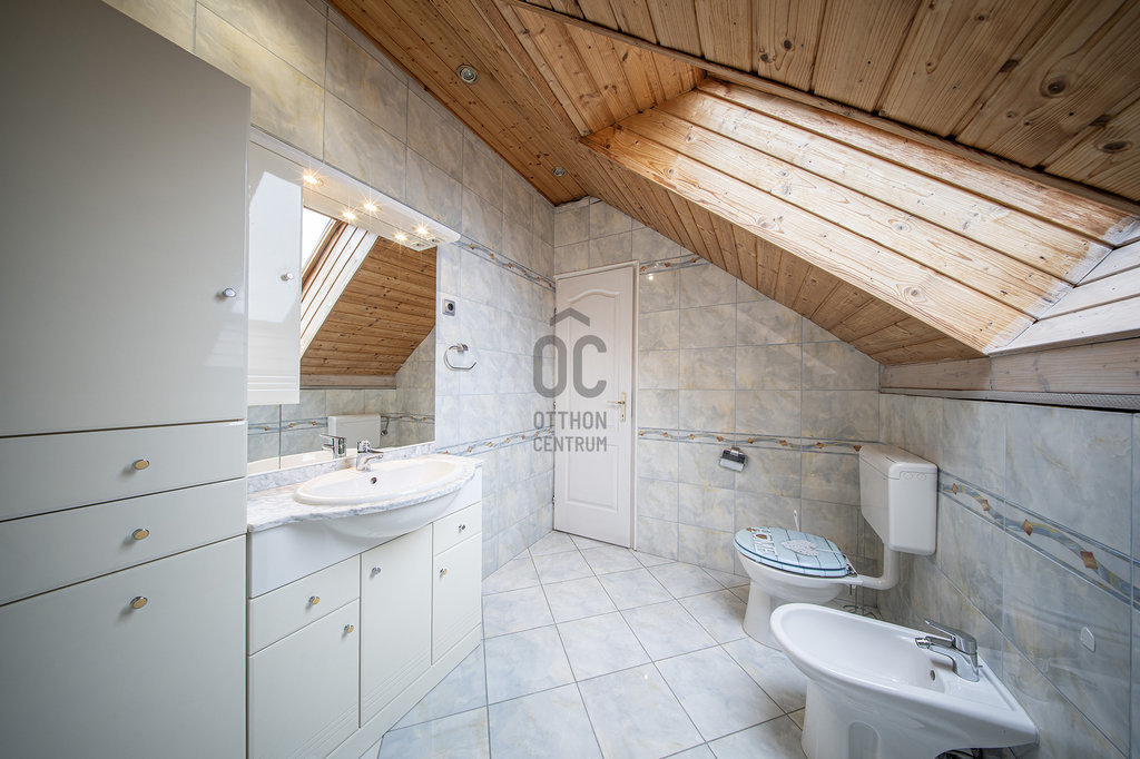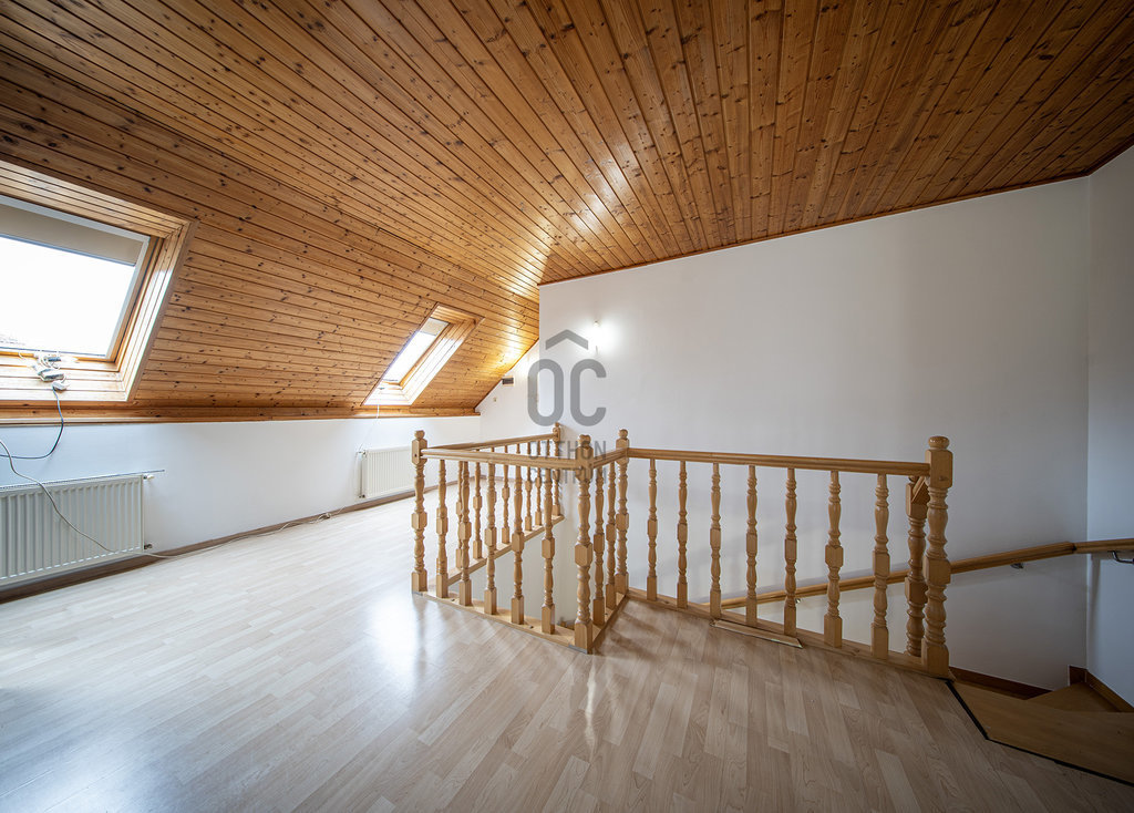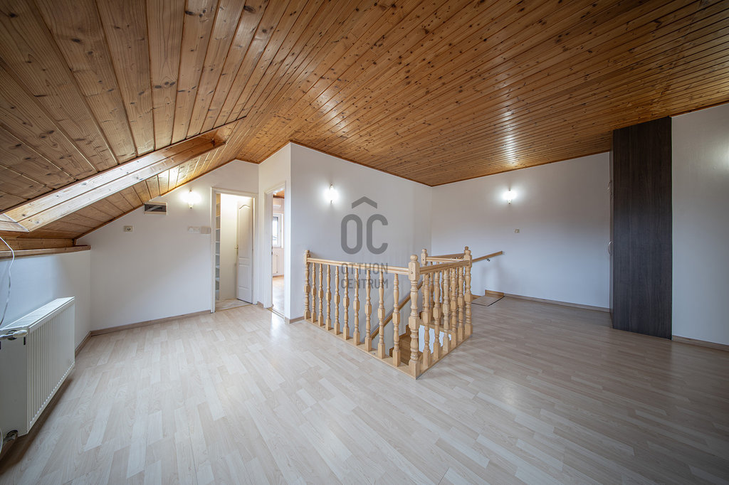 A masszív, tömörfából felépített, kellemesen széles lépcső vezet az emeletre, ahol tágas galéria/közlekedő, óriási (22,45 m2-es) szülői háló saját fürdőszoba/WC-vel, gardróbbal, szauna (nem megépített), kis dolgozószoba (4,82 m2), nagy fürdőszoba sarokkáddal, és két nagy gyerekszoba található. A két gyerekszobából közös erkély nyílik, ahonnan a kertre van kilátás.