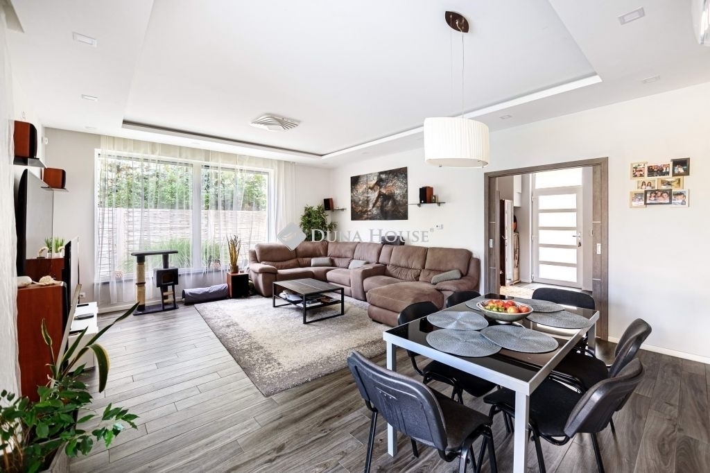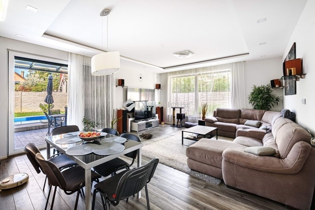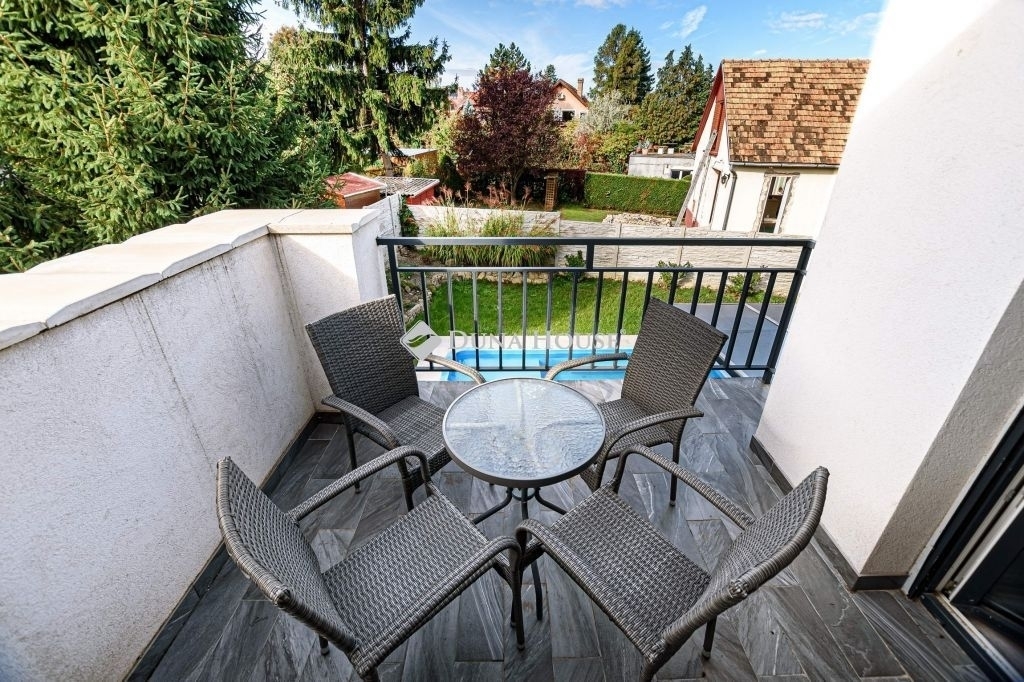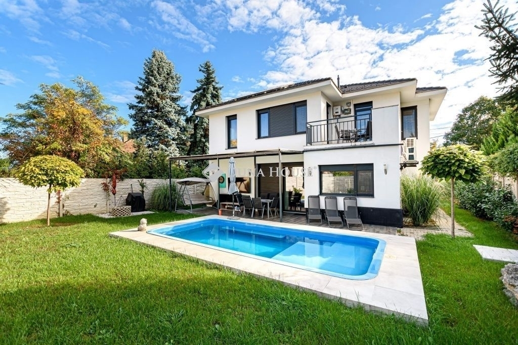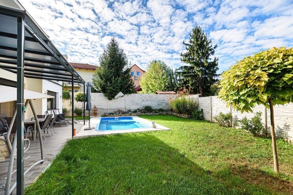 A kertkapcsolatos terasz és a medence lehetőséget kínál a pihenésre és az otthon töltött idő élvezetére, miközben a zöldövezeti környezet és a közeli kamaraerdő garantálja a friss levegőt és a természet közelségét.
