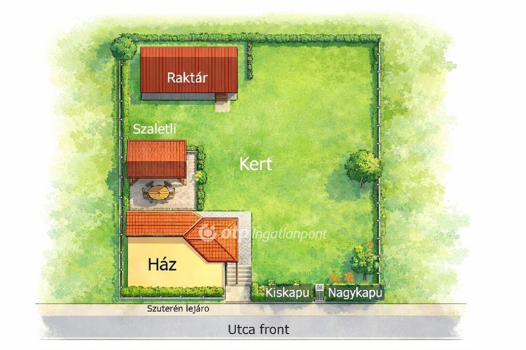Különálló, könnyűszerkezetes raktár : 72 nm, A telek hátsó részében, teljesen elkülönítve Nagy teherautóval is megközelíthető. A kertben egy 25 nm-es szaletli. Gondozott kert kerti tavacskával. Térkövezett udvar és közlekedők 4-6 gépkocsi parkolása telken belül 3,5 tonnás tehergépkocsi behajtása és parkolása is lehetséges. Utcán a parkolás ingyenes.