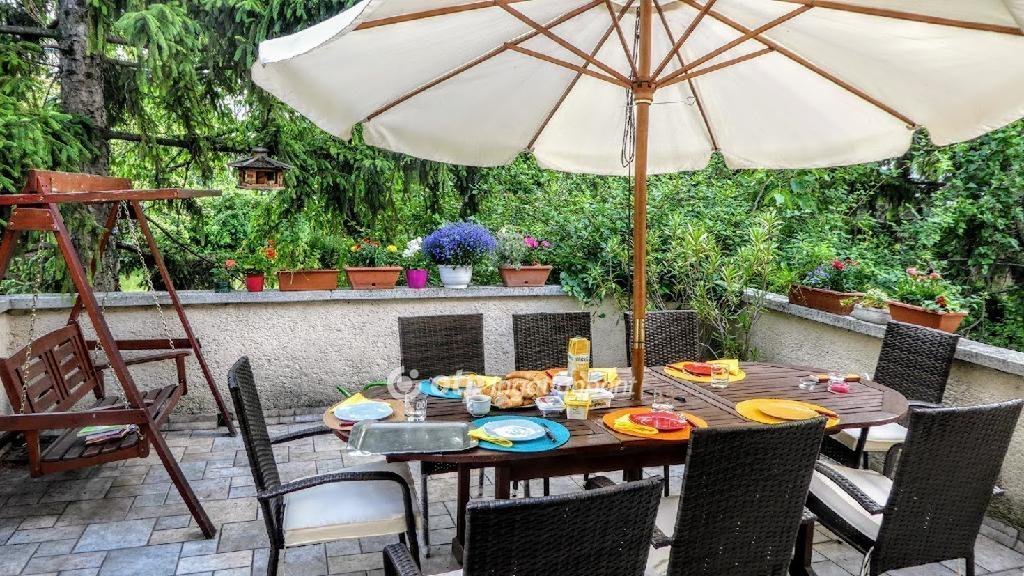 A nappalihoz tartozó terasz egy belső kertre néz, melyet nagy fák és sűrű növényzet zár el a külvilágtól. A kertben medence vagy játszótér is elhelyezhető.