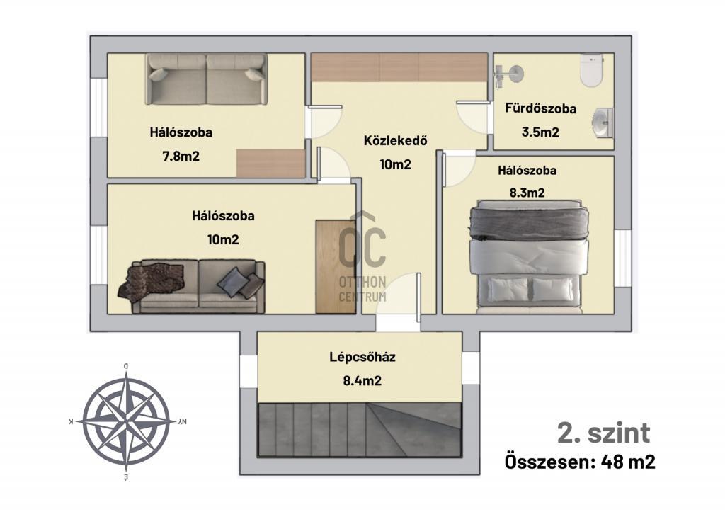 - Közlekedő, három hálószoba, fürdőszoba-wc.