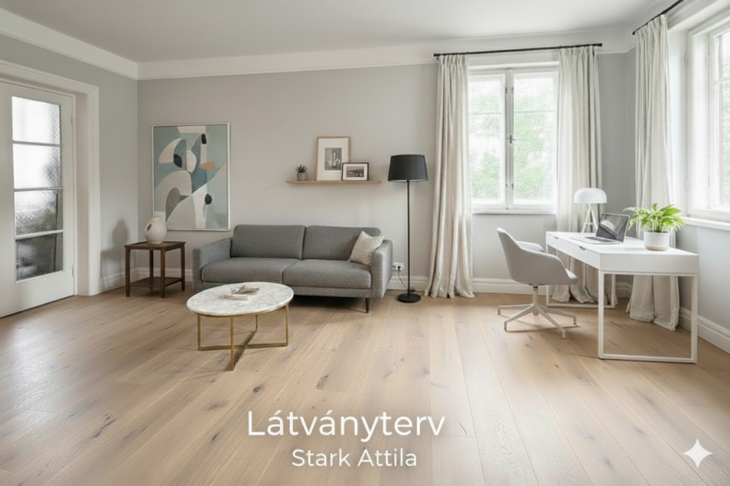 A lakásba belépve jobbra külön WC található, az előszobából jobbra a nappali, balra pedig egy kisebb szoba nyílik. A közlekedő végén helyezkedik el a konyha, a spájz és a fürdőszoba, ahonnan a másik hálószoba is megközelíthető. A lakás 4–5 évvel ezelőtt beázott a felette lévő teraszról, ennek nyomai még láthatók, így az ingatlan teljes körű felújítást igényel.