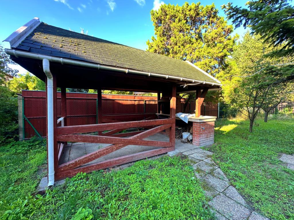 A kertben tágas terasz, fedett pihenőrész és fészer kapott helyet – ideális választás családi vagy baráti összejövetelekhez.