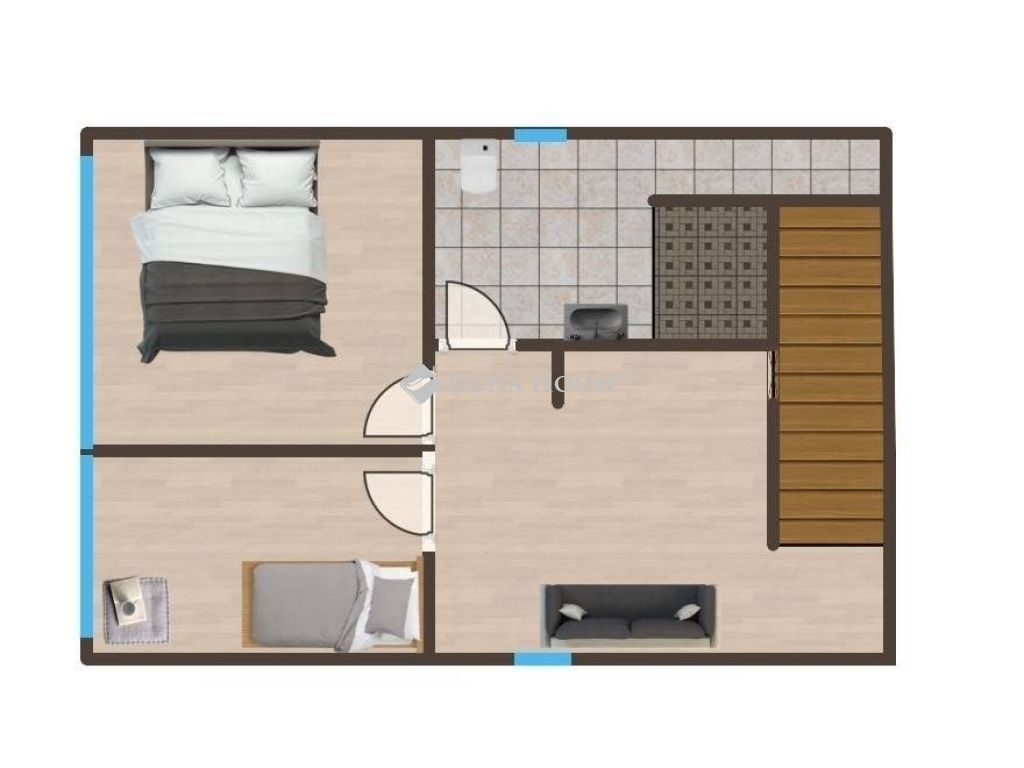 A nappali végében a ház lépcsőháza található, mely lefele a pincébe vezet, felfele pedig a beépített tetőtér szintre.