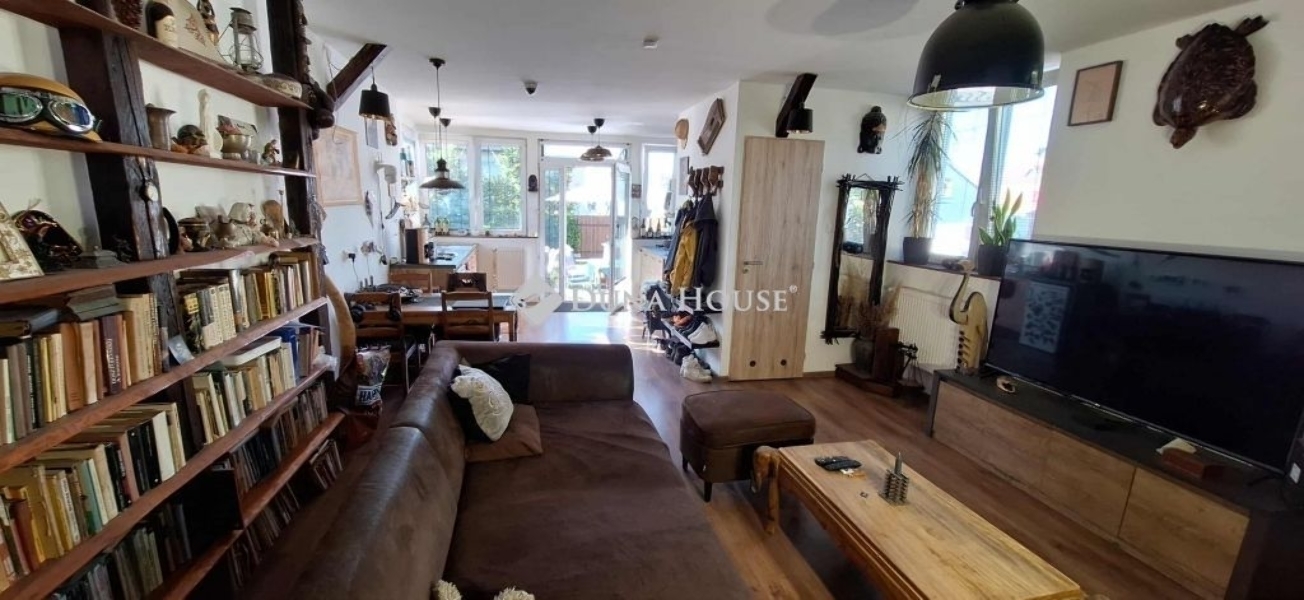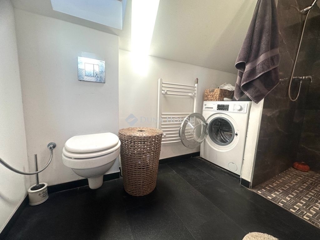 Az ingatlanba a kertből belépve egy tágas, napos nappaliba érkezünk egy étkezős konyhán keresztül, mely egy térbe van a nappalival. Kialakításra került egy vendég fürdőszoba ezen a szinten.