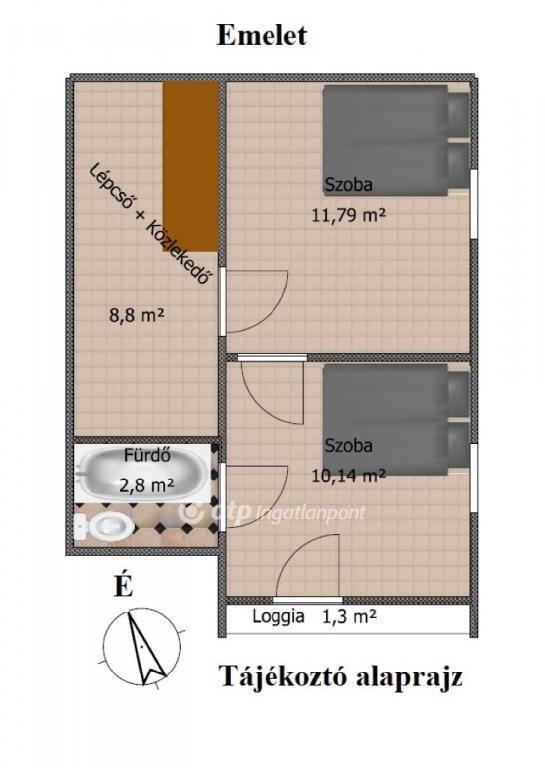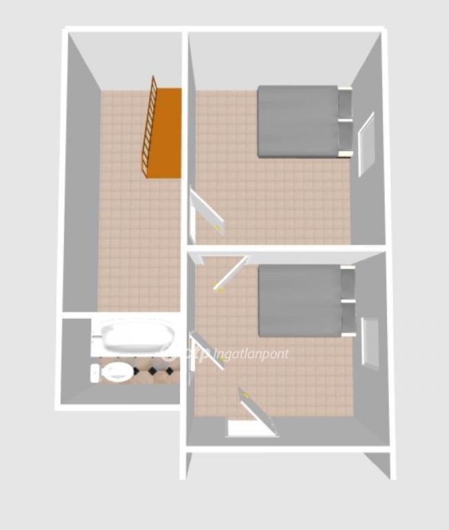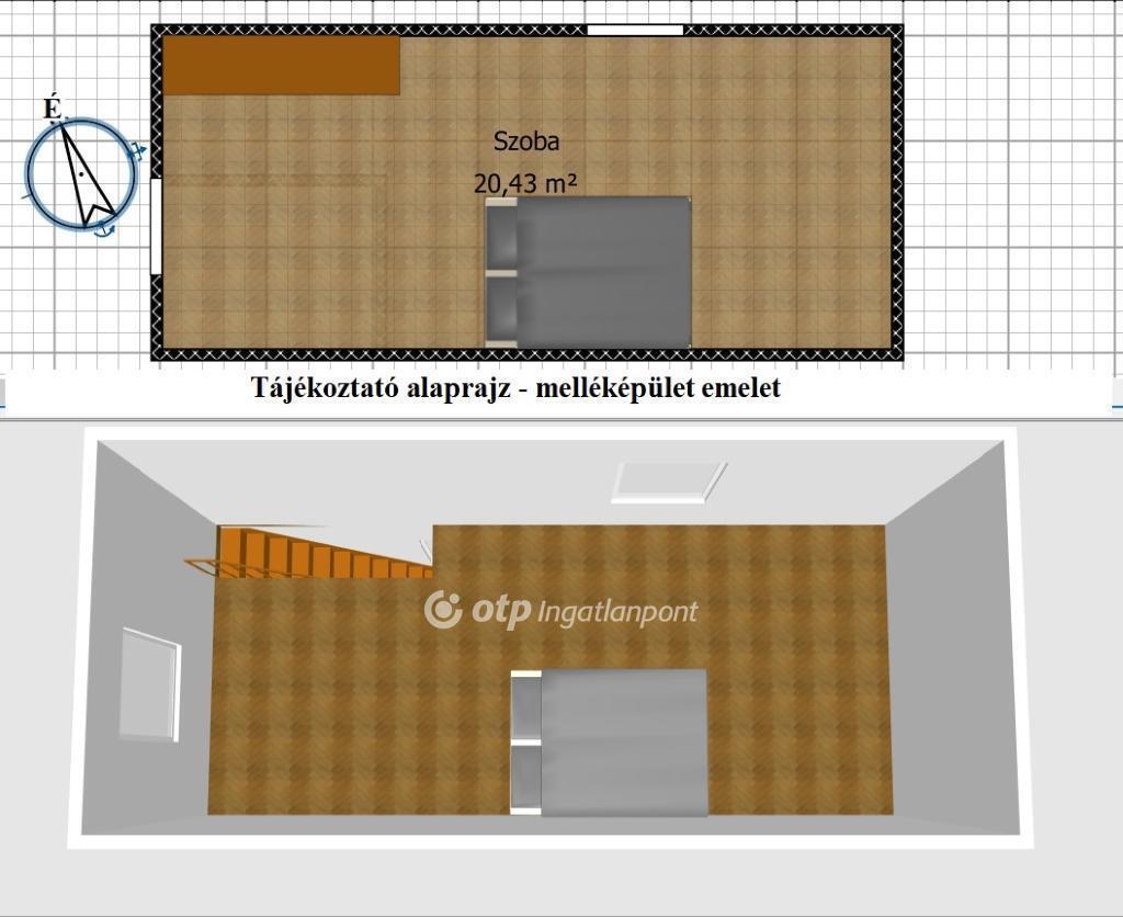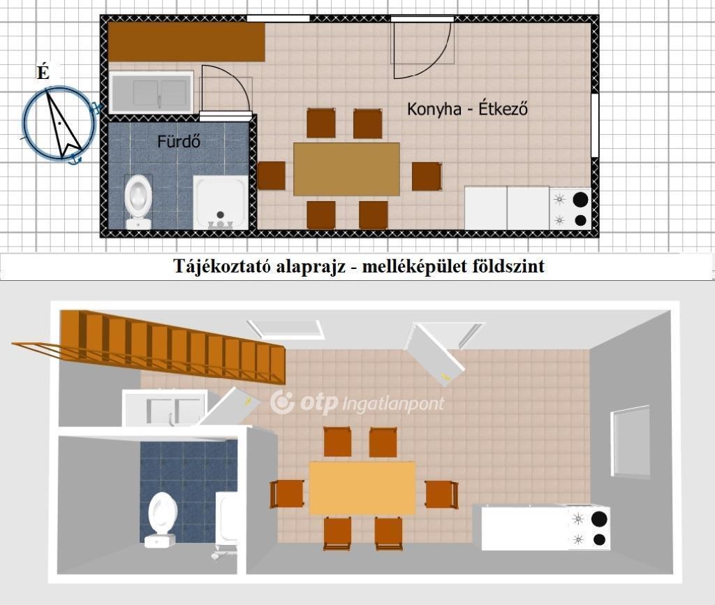 A földszinten amerikai konyhás nappalivá alakítható konyha+étkező, fürdőszoba és WC, az emeleten tágas hálószoba.