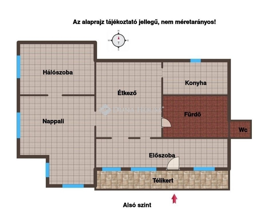 Az alsó szint 80 nm + 14 nm télikert, nappali szoba, hálószoba, konyha, fürdőszoba, WC, étkező és előszoba alkotja.