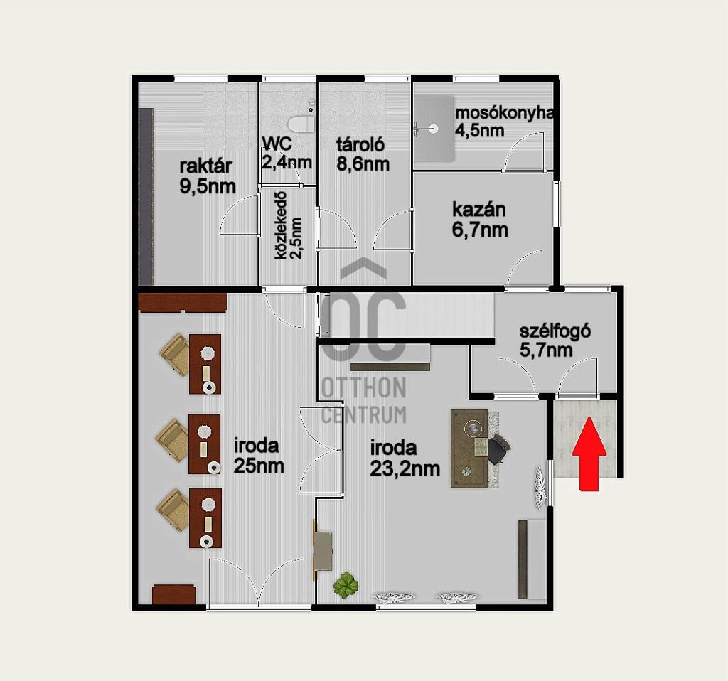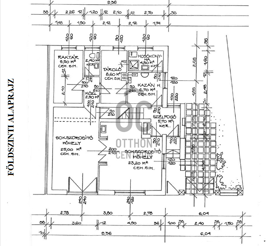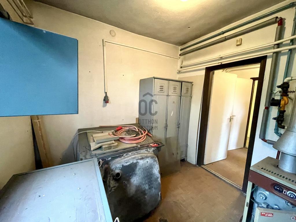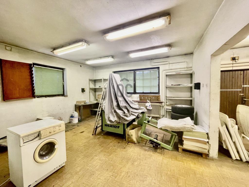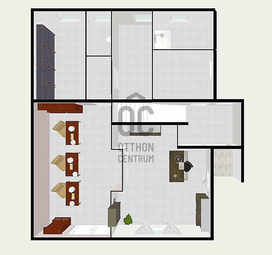 Az alsó szint ipari vagy üzleti tevékenységre alkalmas, 380 V ipari árammal, két műhelyrésszel, raktárral, mosdóval, WC-vel és öltözővel. Korábban nyomda működött itt, de bármilyen kisvállalkozás számára ideális. A helyiségbe kisebb teherautóval is be lehet állni.