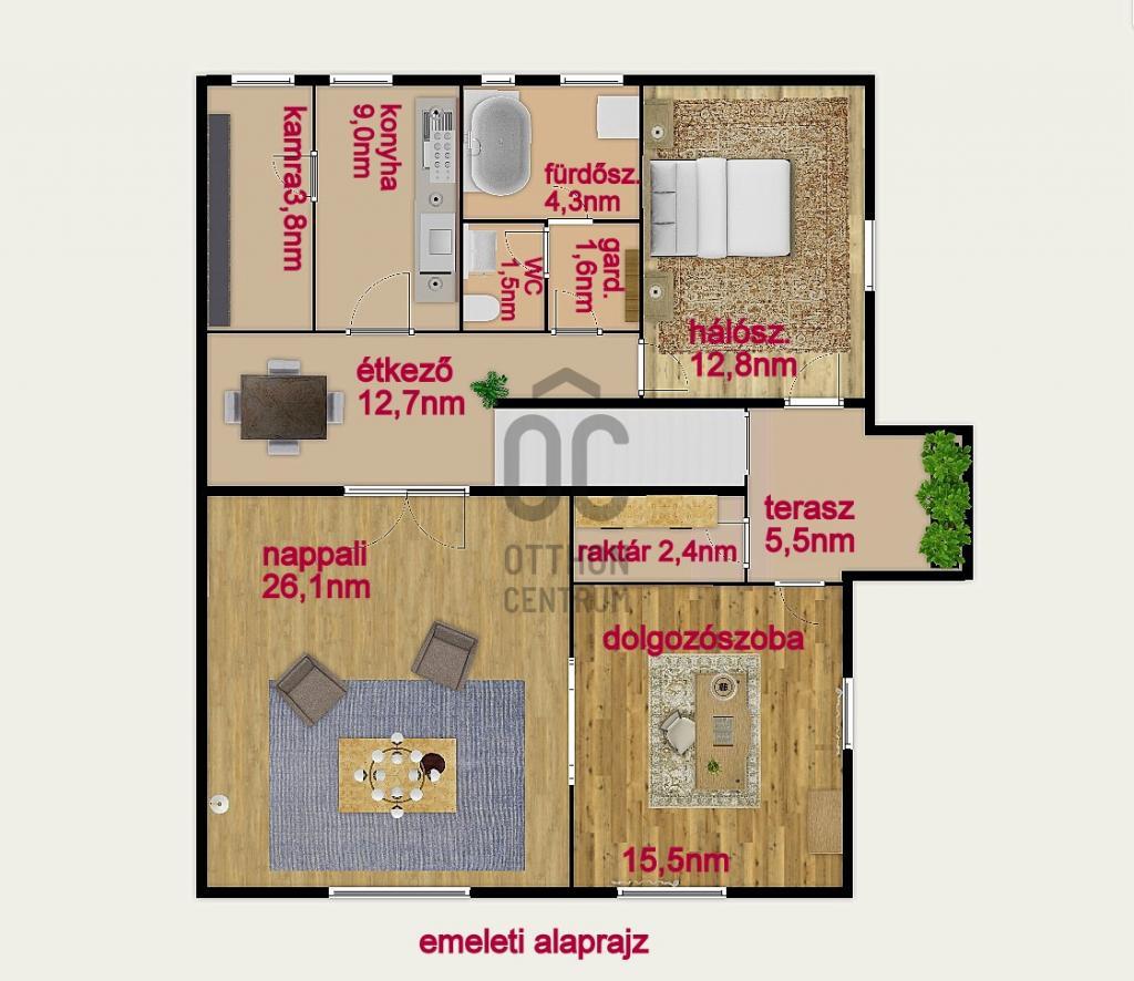 A felső szinten található egy tágas nappali, két hálószoba, konyha, étkező, fürdő, külön WC, terasz, valamint klíma és biztonsági videókapu-rendszer. A lakótér világos, sok ablakkal rendelkezik.