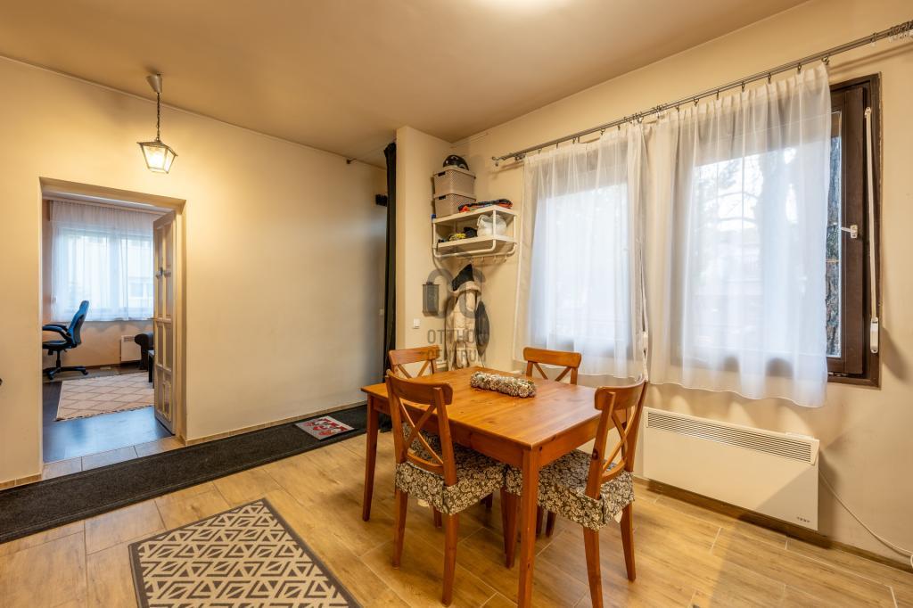 70m2-es a földszint, nagy étkezős konyhával, nappalival, hálóval, kényelmes méretű fürdőszobával.