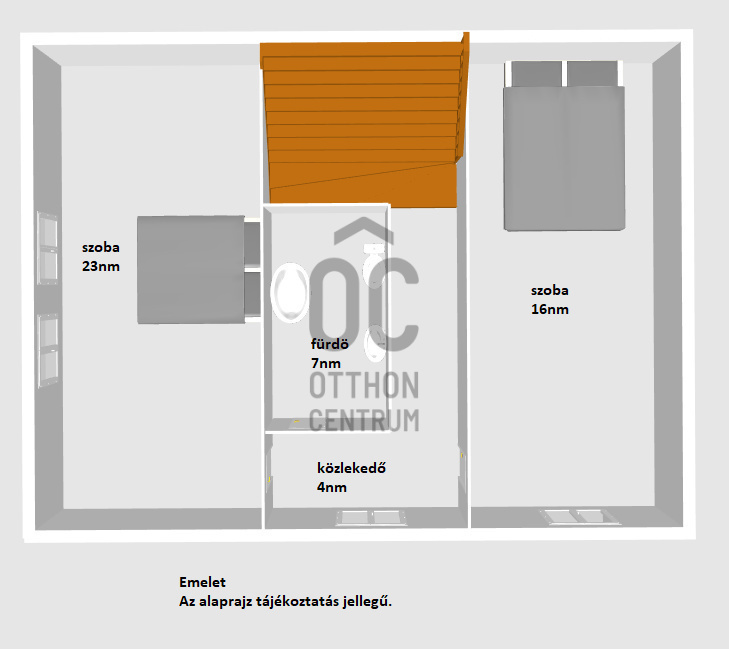 Emelet: 2 szoba, fürdőszoba WC-vel