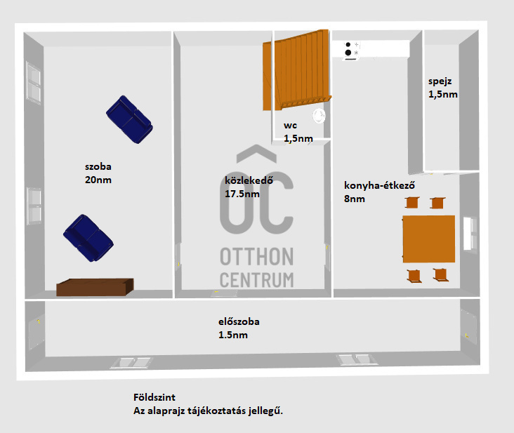 Az ingatlan két szinten helyezkedik el, praktikus elrendezéssel, jól kihasználható terekkel. A földszinten található egy világos, tágas nappali vagy szoba, külön konyha–étkező, valamint egy spejz, amely kiváló tárolási lehetőséget biztosít. A felső szinten két külön bejáratú hálószoba kapott helyet, továbbá egy fürdőszoba WC-vel. Az emeleti egyik szobához erkély is tartozik, ahonnan kellemes kilátás nyílik a kertre.