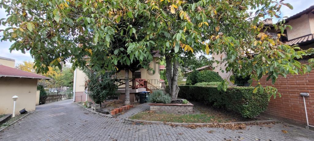Kert jól gondozott, virágos, nagy fák(fenyő, dió), sövények, kis füves terület, térkő burkolat, kerítéssel elválasztott első- és hátsó kert, kukatároló helyiség, fúrt kút is található.