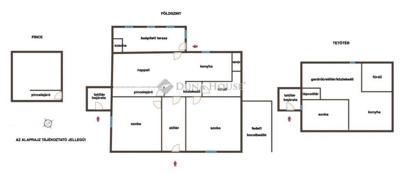 Földszint: nappali, konyha, 3 szoba, fürdőszoba + WC, közlekedő, beépített terasz, szaunával