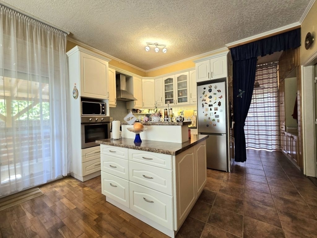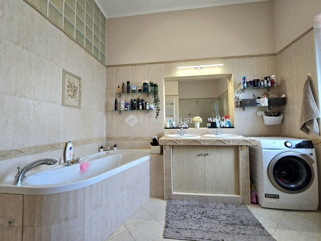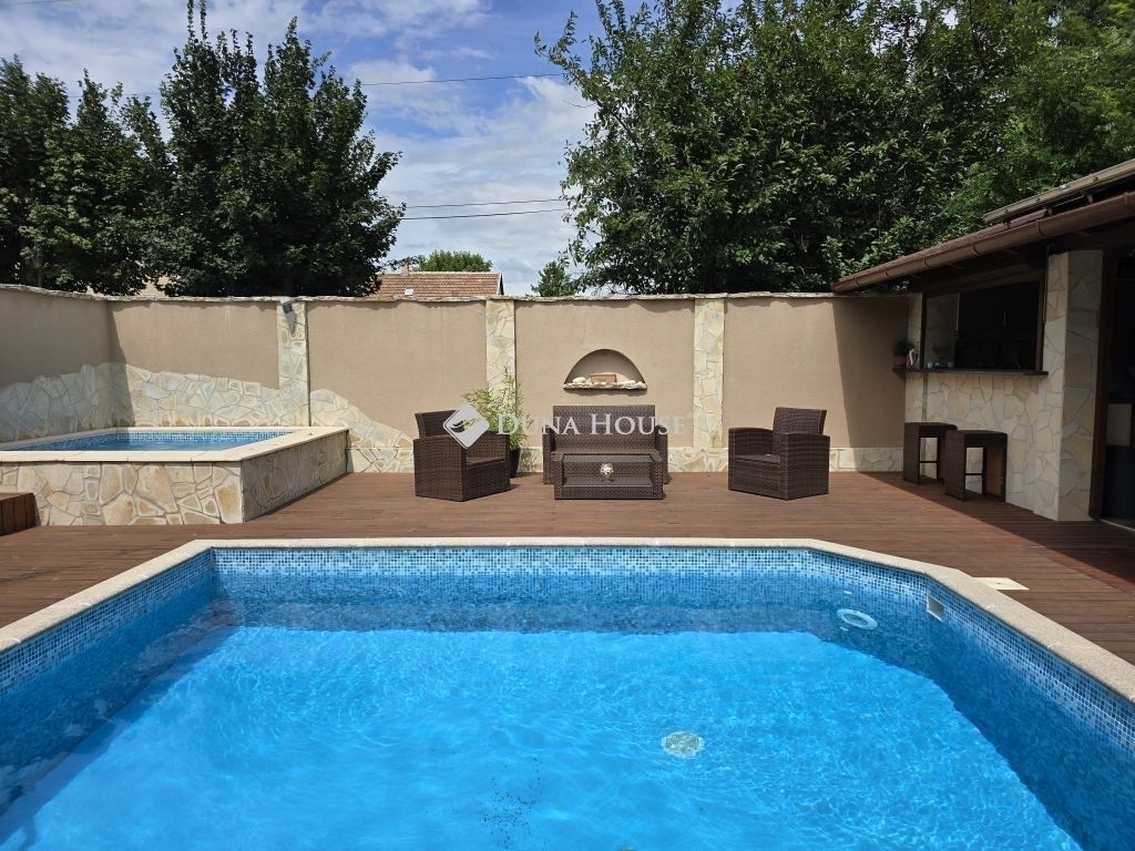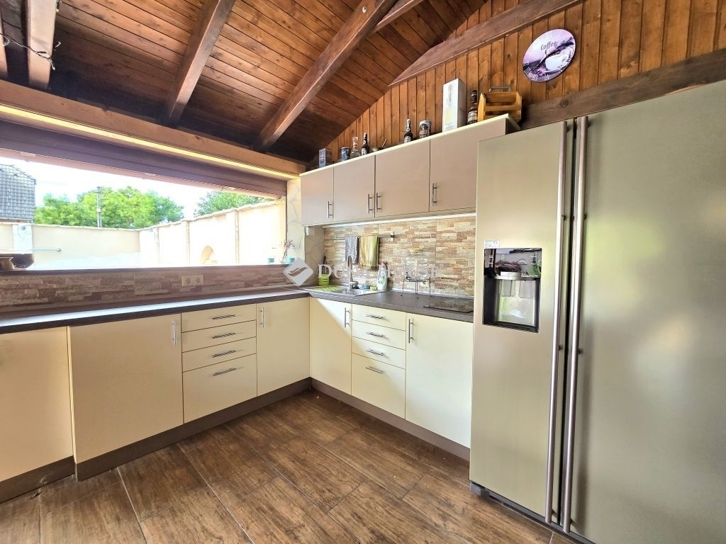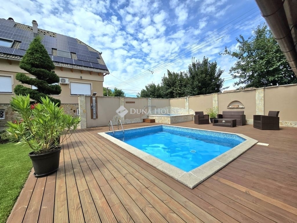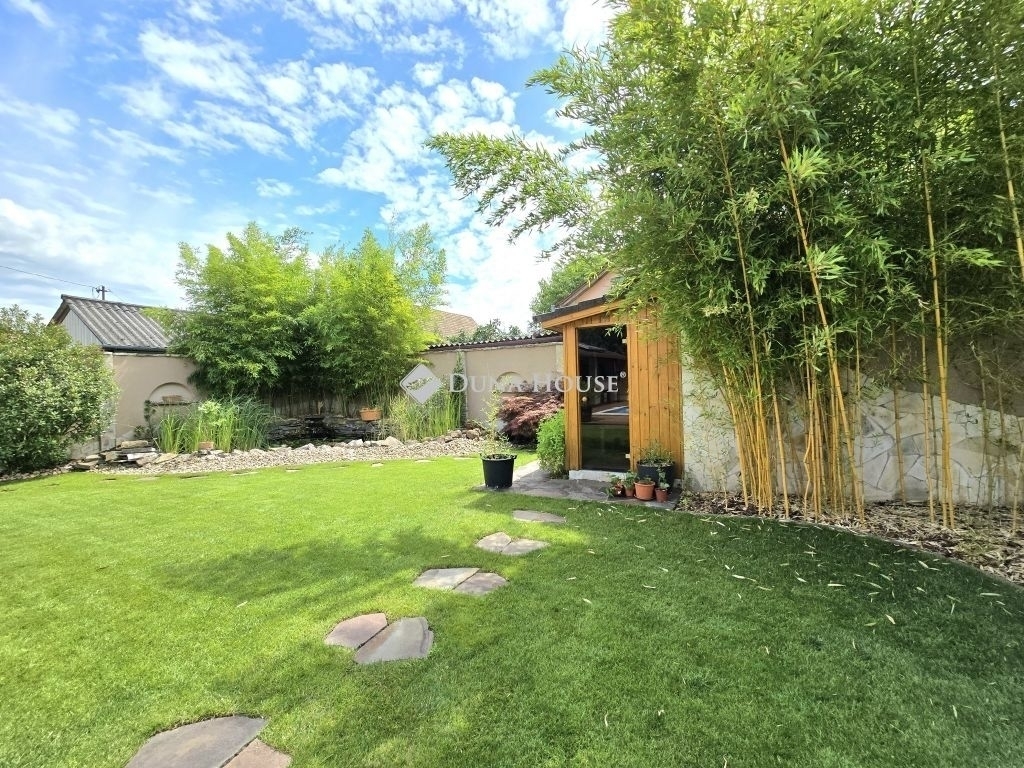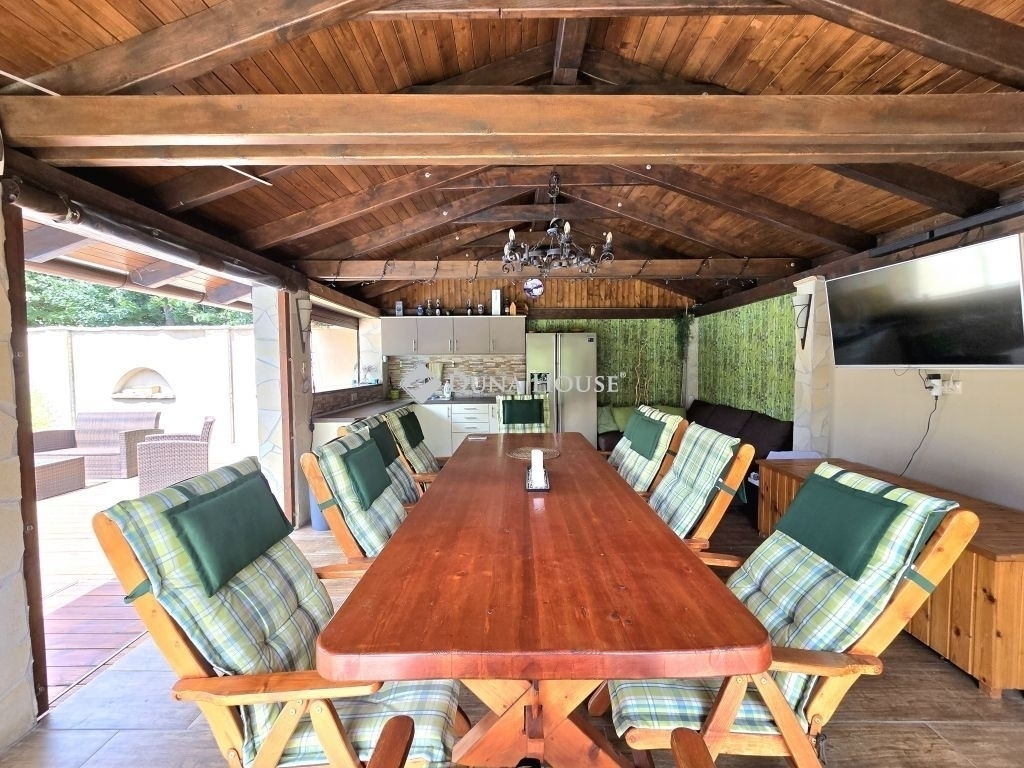 A ház félszuterén szintjén található egy háztartási helyiség, konyha és egy kis PUB rész is, amely ideális helyszín lehet baráti összejövetelekhez vagy családi eseményekhez. A kerti részen három zónás öntözőrendszer gondoskodik a növényzet ápolásáról, míg a szauna, jakuzzi és medence a kikapcsolódás és relaxáció tökéletes eszközei. A kerti grillező és sütögető hely egy fedett terasszal egészül ki, amely gépesített konyhával, 10 személyes étkezővel és TV-vel van felszerelve, így a kültéri szórakozás minden évszakban lehetséges.
