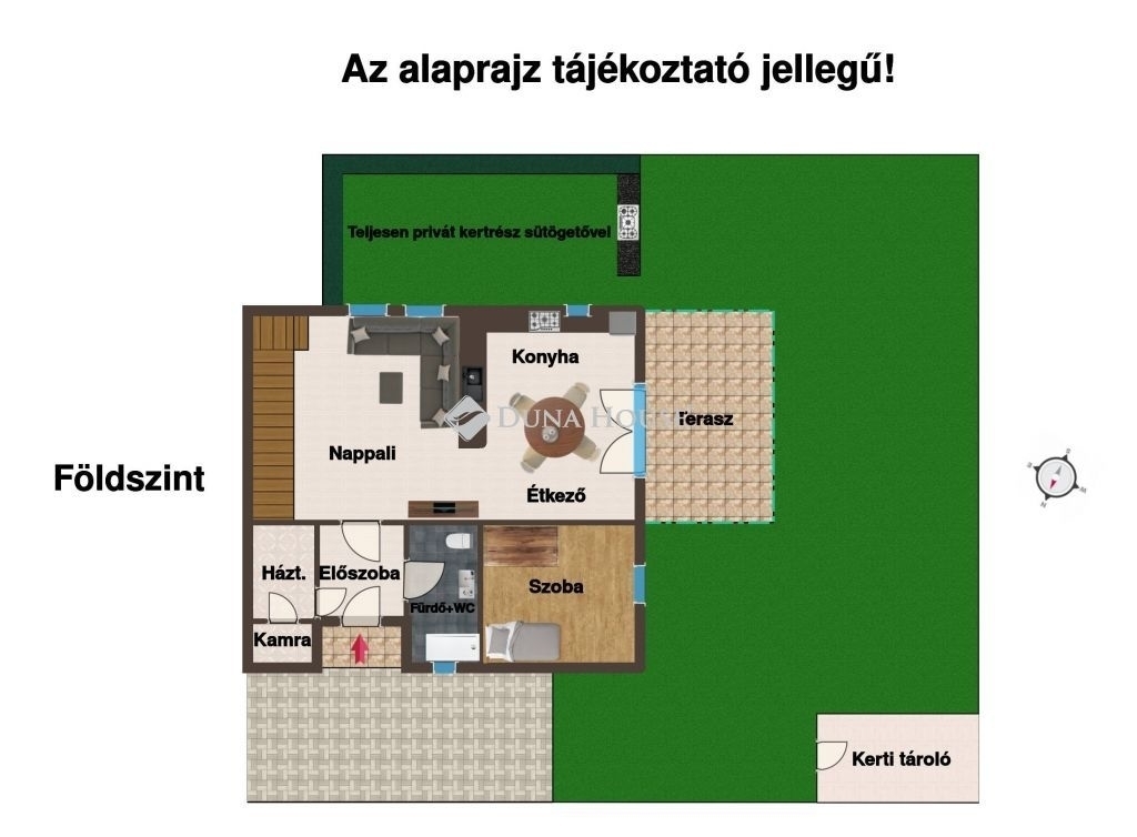 A kertben található egy teljesen elszeparált, tujákkal kerített kavicsos terület is, melynél sütögető található, így ha teljes nyugodtságban szeretnének ebédelni, olvasni, vagy csak pihenni, bátran megtehetik.