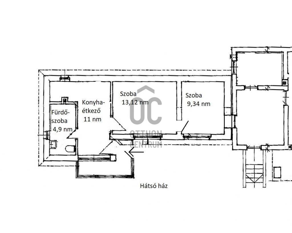 A nagy ház mögött, ahhoz hozzáépítve helyet kapott még egy földszintes kialakítású, két szoba-konyha-fürdőszoba helyiségekből álló lakás.