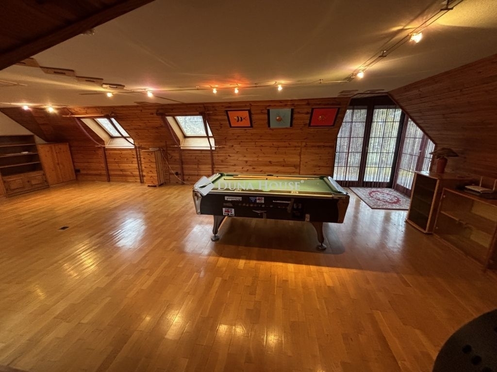 A melléképület dupla garázzsal, hobbyszobákkal, valamint egy külső bárral büszkélkedhet, a tetőtér pedig további lakó- vagy munkahelyiségekké alakítható.