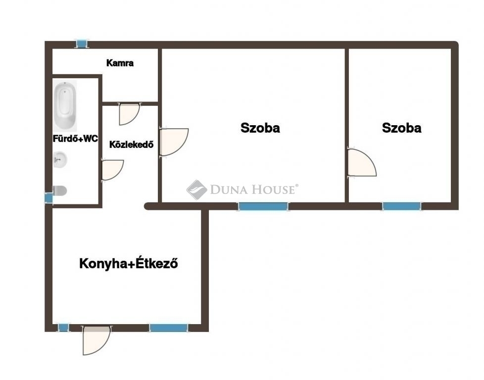 A lakótér elosztása praktikus: tágas konyha-étkező, kamra, két nagyméretű szoba, közlekedő és egy kádas fürdőszoba található benne.