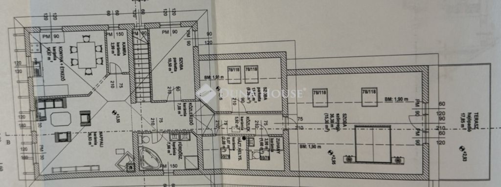 A lakóingatlan főbb helyiségei: Nappali (27 nm), konyha-étkező (15 nm), 3 db hálószoba (27 nm, 14 nm és 10,5 nm), 2 db fürdőszoba (7,7 nm és 4 nm), háztartási helyiség (5 nm), kamra (3 nm). A tágas szülői hálószobában 2 leválasztott gardrób került kialakításra és egy nagy méretű fedett terasz tartozik hozzá.