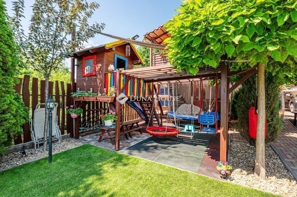 A mediterrán hangulatú kertben nagy méretű (10*4*1,5 m) fedhető medence, játszótér, kerti kemence és grillező, valamint egy szaletli is helyet kapott.