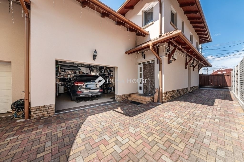 A térkövezett kocsibeállón keresztül 2 db garázs is elérhető, melyből a nagyobb (30 nm) 2 személygépkocsi tárolására is alkalmas, szerelőaknával ellátott. Mind a kapu, mind a garázsajtók elektromosan nyithatók.