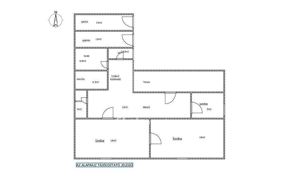 A ház elrendezése praktikus: szobák, konyha, étkező, fürdőszoba, gépészeti helyiség, valamint garázs, amely autóval is könnyen megközelíthető. A fűtésről kombi cirkó kazán és radiátorok gondoskodnak, a melegvíz-ellátás szintén erről működik, de vegyestüzelésű kazán használatára is van lehetőség. Az ingatlanhoz aknás garázs és ásott kút is tartozik.