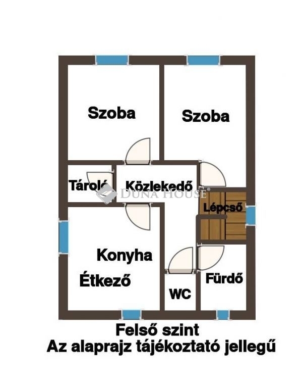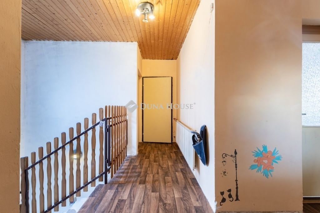 Az alsó szintről masszív, beton szerkezetű lépcsőn érhetjük el a tetőteret, ahol egy előtér, egy tároló, a konyha étkezővel, valamint 2 szoba, egy kádas fürdőszoba és a külön-bejáratú WC került kialakításra 2023-ban.