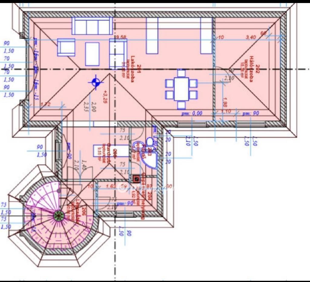 Jelenlegi elosztása 4 + 1 fél szoba, duplakomfortos.