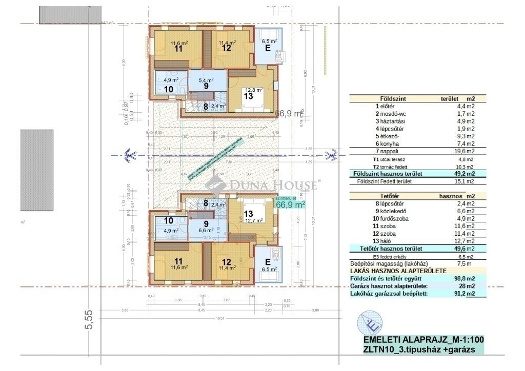 Az emelet három kényelmes méretű szobát kínál, melyekhez egy modern fürdőszoba tartozik WC-vel együtt. A szobákban több beépített szekrény kialakítására is lehetőség van. Ezen a szinten található egy 6,5 m²-es erkély, amely az egyik szobából közelíthető meg, kellemes kilátást és privát szabadtéri pihenőteret biztosítva.